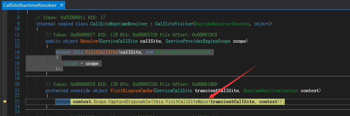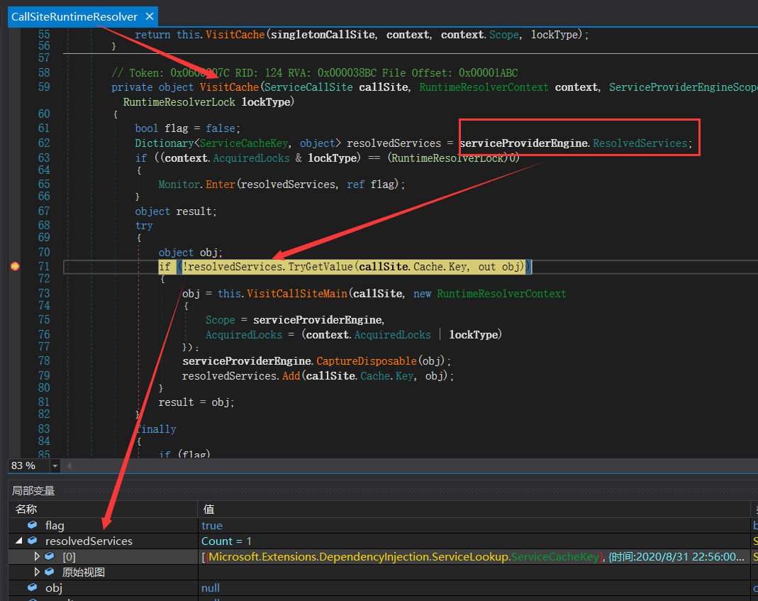 仔细看上面代码的这句话: if (!resolvedServices.TryGetValue(callSite.Cache.Key, out obj)) 一旦字典存在就直接返回,否则就要执行 new 链路,也就是 this.VisitCallSiteMain。