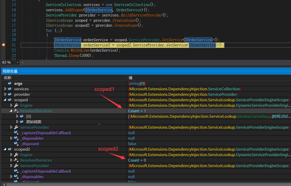 从图中可以看到,scoped1 和 scoped2 中的 ResolvedServices 拥有不用的count,也就说明两者是独立存在的,相互不影响。
