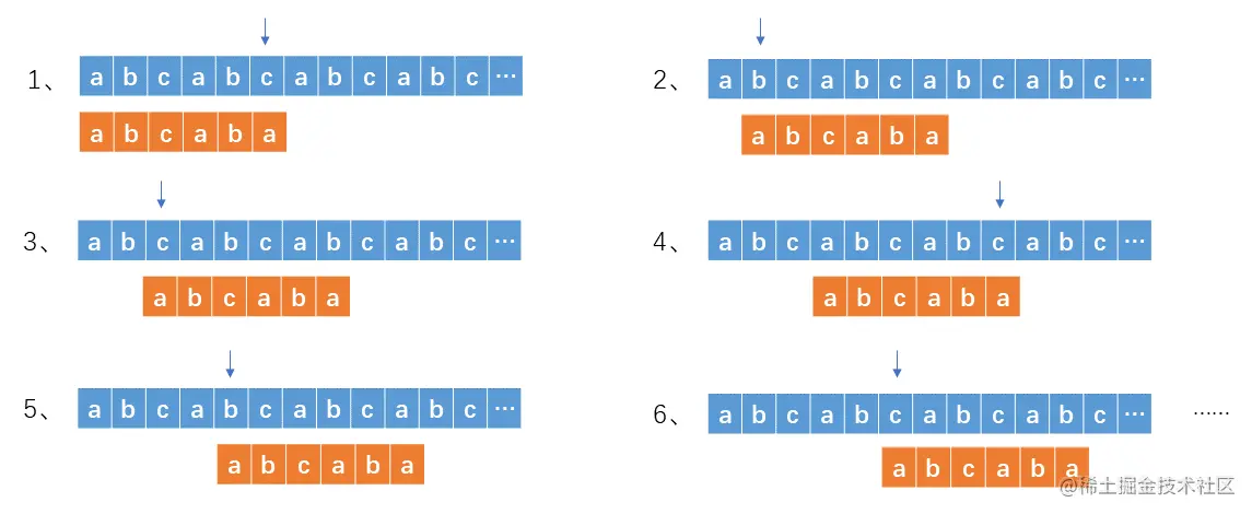 其中,第1步到第2步,比较指针从6变为1的过程我们称为回溯。