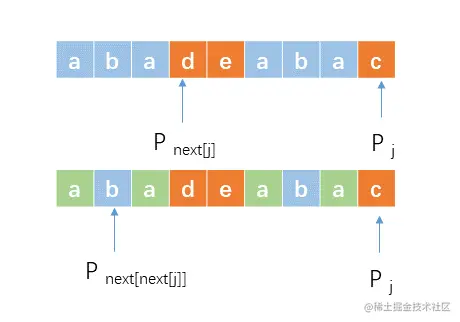 当在第j位不匹配,j移动到next[j]的位置上,与当前位置进行匹配,也就是继续比较pnext[j]。如下图上。但是我们发现pnext[j]上的d
