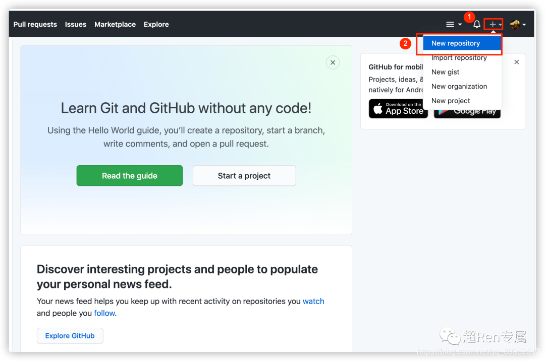 右上角,头像或标识旁边的➕,单击然后选择 “New repository”。