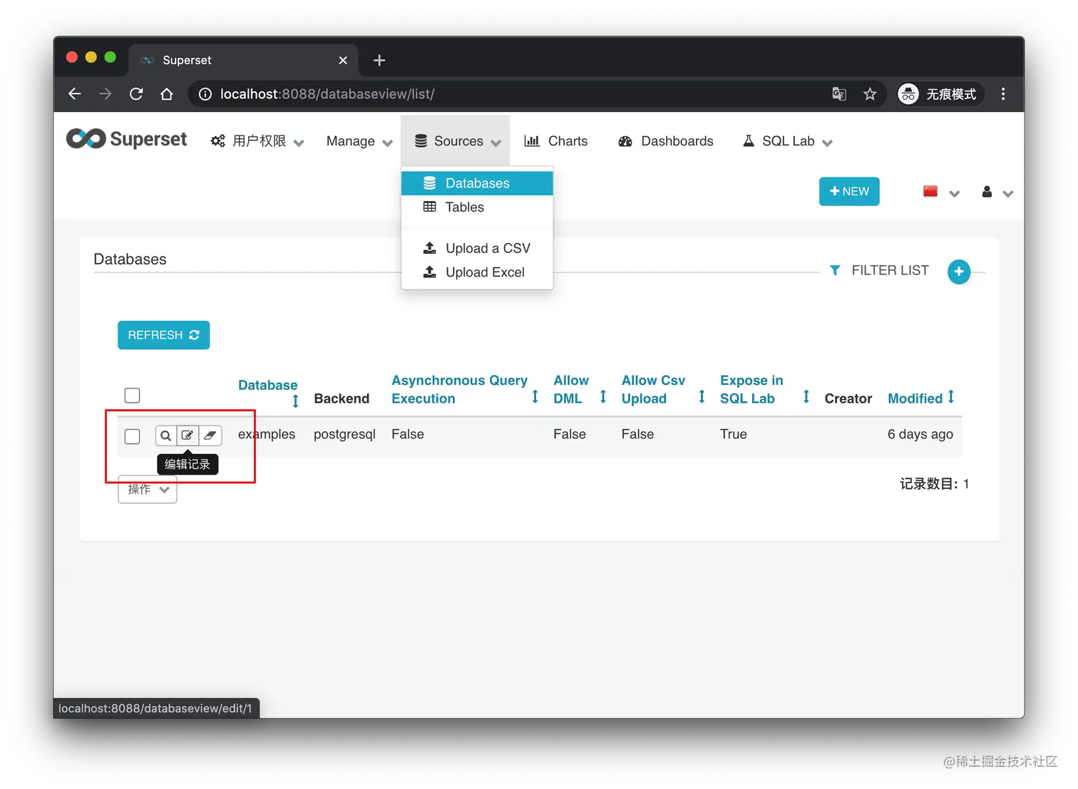 编辑 Databases 列表的 examples 数据库记录: