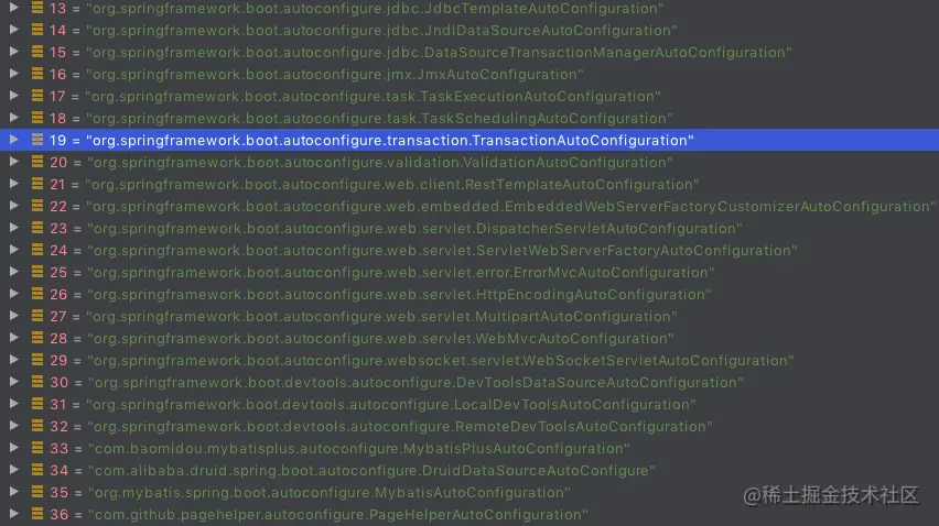 processedConfigurations是将会使用到的配置类bean全限定名,截取其中一部分属性如下,其中org.springframework.boot.autoconfigure.transaction.TransactionAutoConfiguration是与事务自动配置有关的。(关于配置类bean的由来请点击此处)
