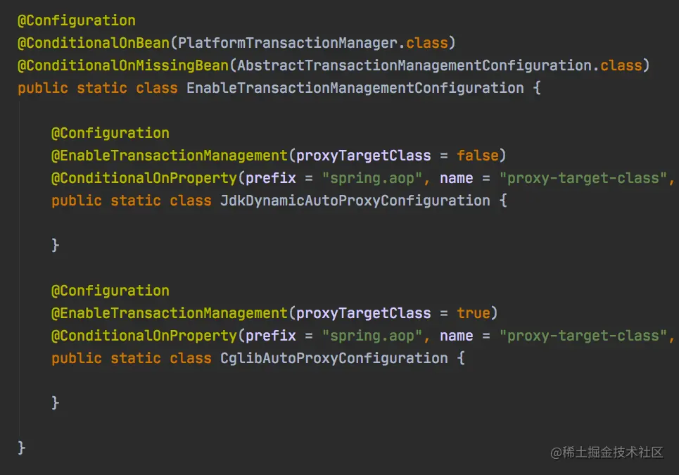 TransactionAutoConfiguration类,见到如下属性,说明事务类的引入最终还是利用@EnableTransactionManagement这个注解。