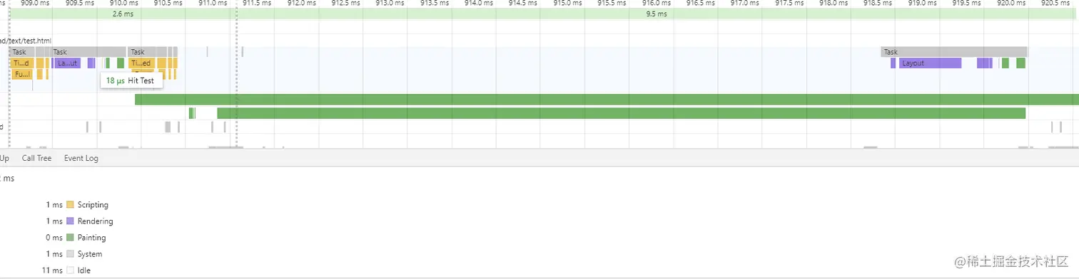 图中一共绘制了两帧,第一帧 910ms,第二帧 920ms,都远远高于每秒 60HZ(16.7ms)的频率,所以两次 event loop 的间隔很短同样会进行绘制。