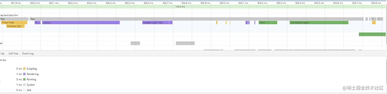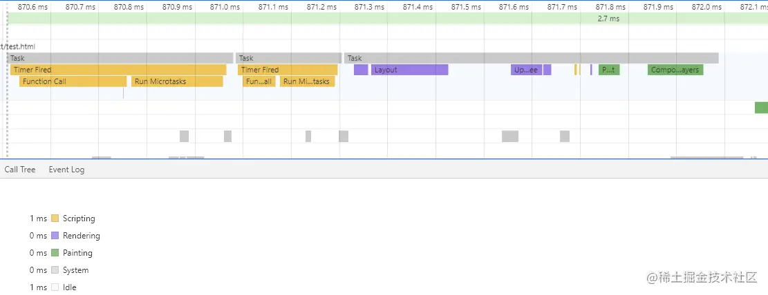 两块黄色的区域就是 setTimeout,在 1342ms 处绿色部分,浏览器对 con.textContent = 0 的变动进行了绘制。在 1357ms 处绿色部分,绘制了 con.textContent = 1。