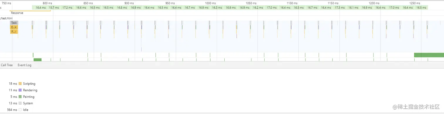可以看到一大块黄色区域,上半部分有一根绿线就是点击后的第一次绘制,脚本的运行耗费大量的时间,并且阻塞了渲染。