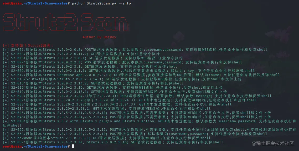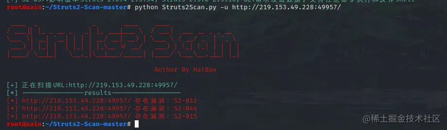 虽然我们知道这是含有Apache Struts2远程代码执行漏洞(S2-015)的靶机,不过我们还是按照正常步骤来测试一下,我用的是Struts2-Scan扫描工具,在此附上下载链接和使用方法(github.com/HatBoy/Stru…)。
