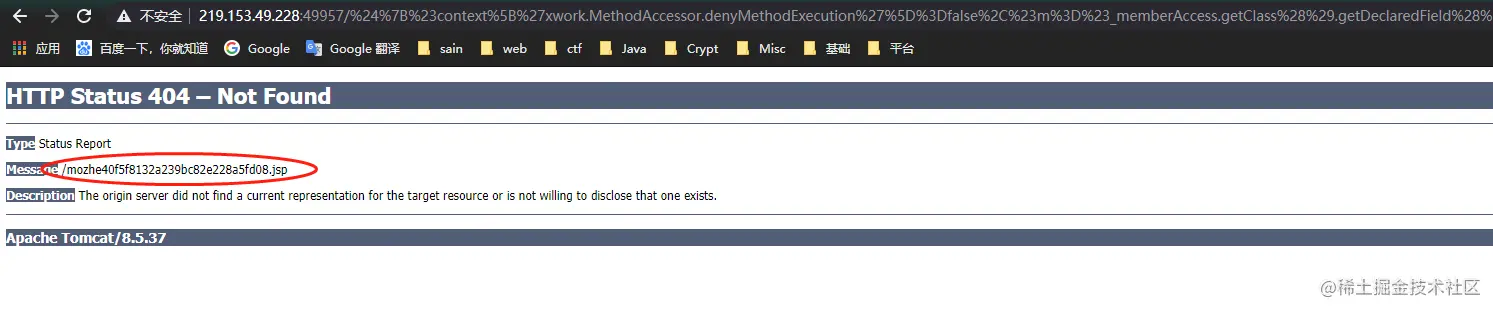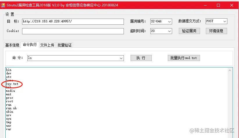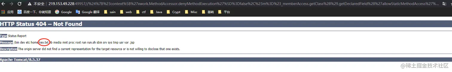 发现存在S2-012,S2-046,S2-015漏洞。我在网上看到不少在这里就转到了利用S2-46漏洞直接接行了命令执行或shell上传 ψ(`∇´)ψ ,说好的S2-015漏洞呢!!就像下面这样。直接就可以找到key: