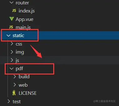 2.将下载下来的包放置static目录下,作为静态文件存放,如果是cli3搭建的脚手架,放置在public目录下,这里我习惯将下载下来的包重命名为pdf,便于自己查看。