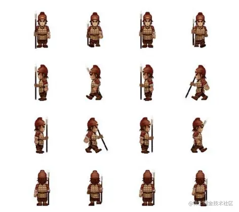 人物动作变换我以前做像素RPG游戏的时候接触过,通过上下作用控制人物走动,像素人物走动就是通过不断切换图片的效果做到的。游戏人物行走图类似如下: