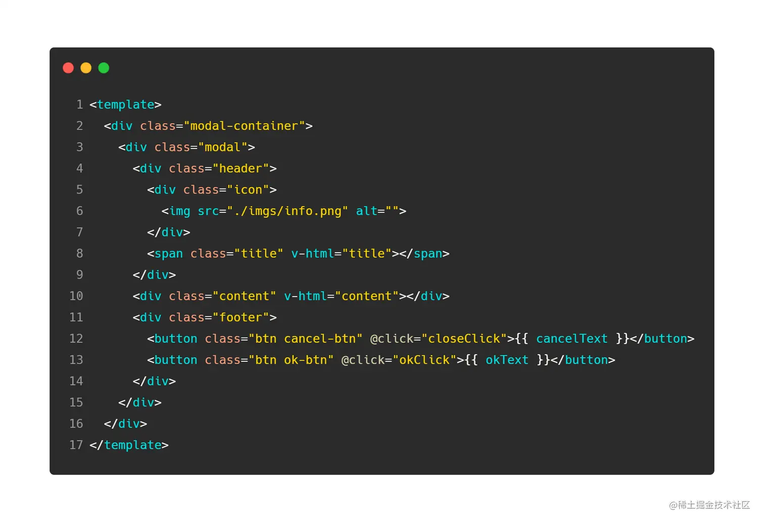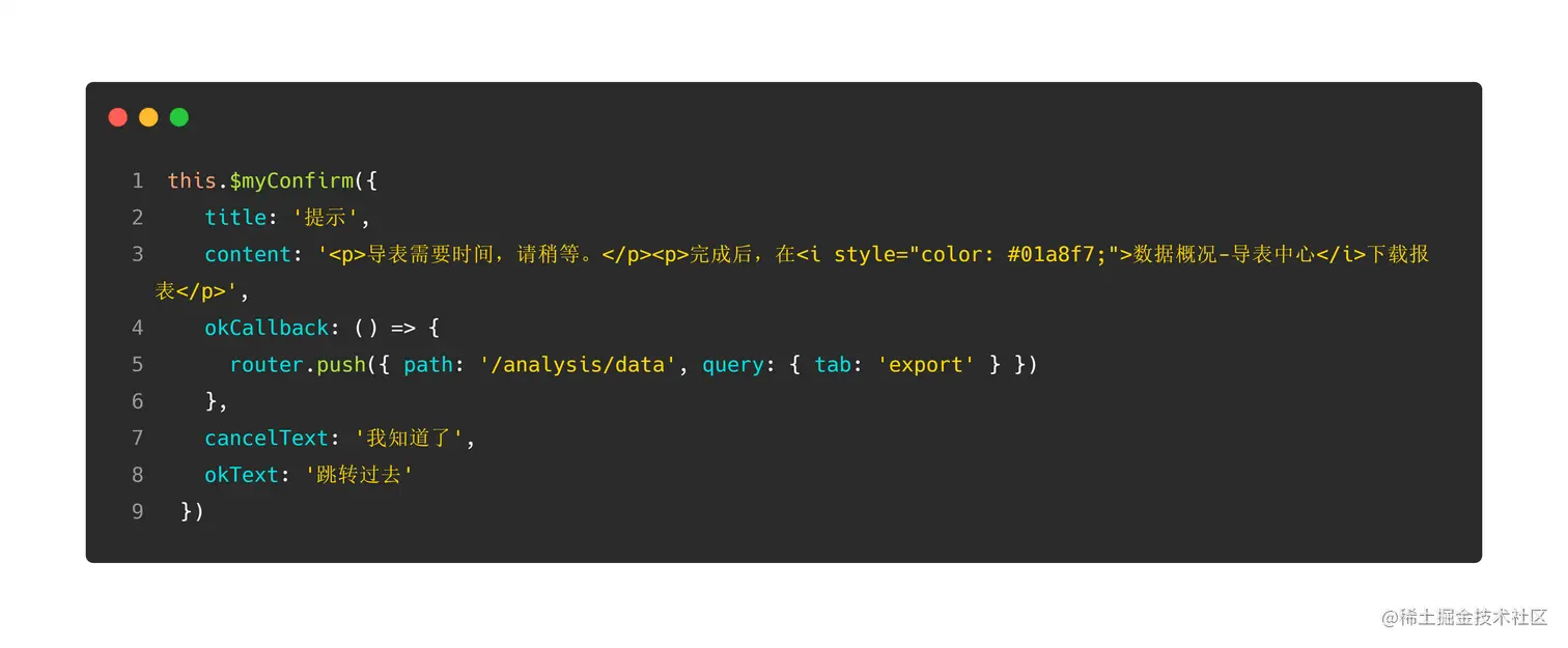 template: 这里我们提供了title,content和两个按钮的自定义文字