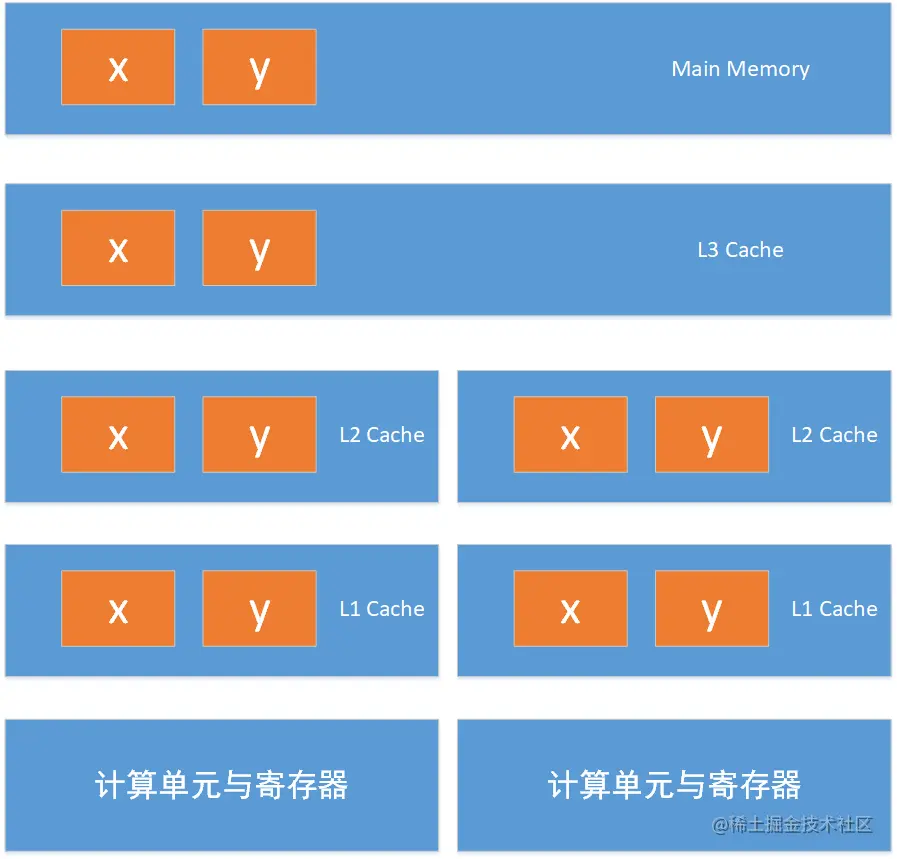 CPU为了提高指令执行效率,需要解决的性能瓶颈为对内存的访问。CPU的速度往往会比去主存中读数据要快两个数量级。所以如第一张图所示,CPU会引入L1 Cache、 L2 Cache甚至L3 Cache。此时,如果CPU执行时需要访问的数据不在Cache中,则需要到主存中读取。那么在读取到数据的这段时间内,CPU会继续执行其他没有依赖关系的指令,这就会导致乱序问题。以下代码可以证明乱序问题: