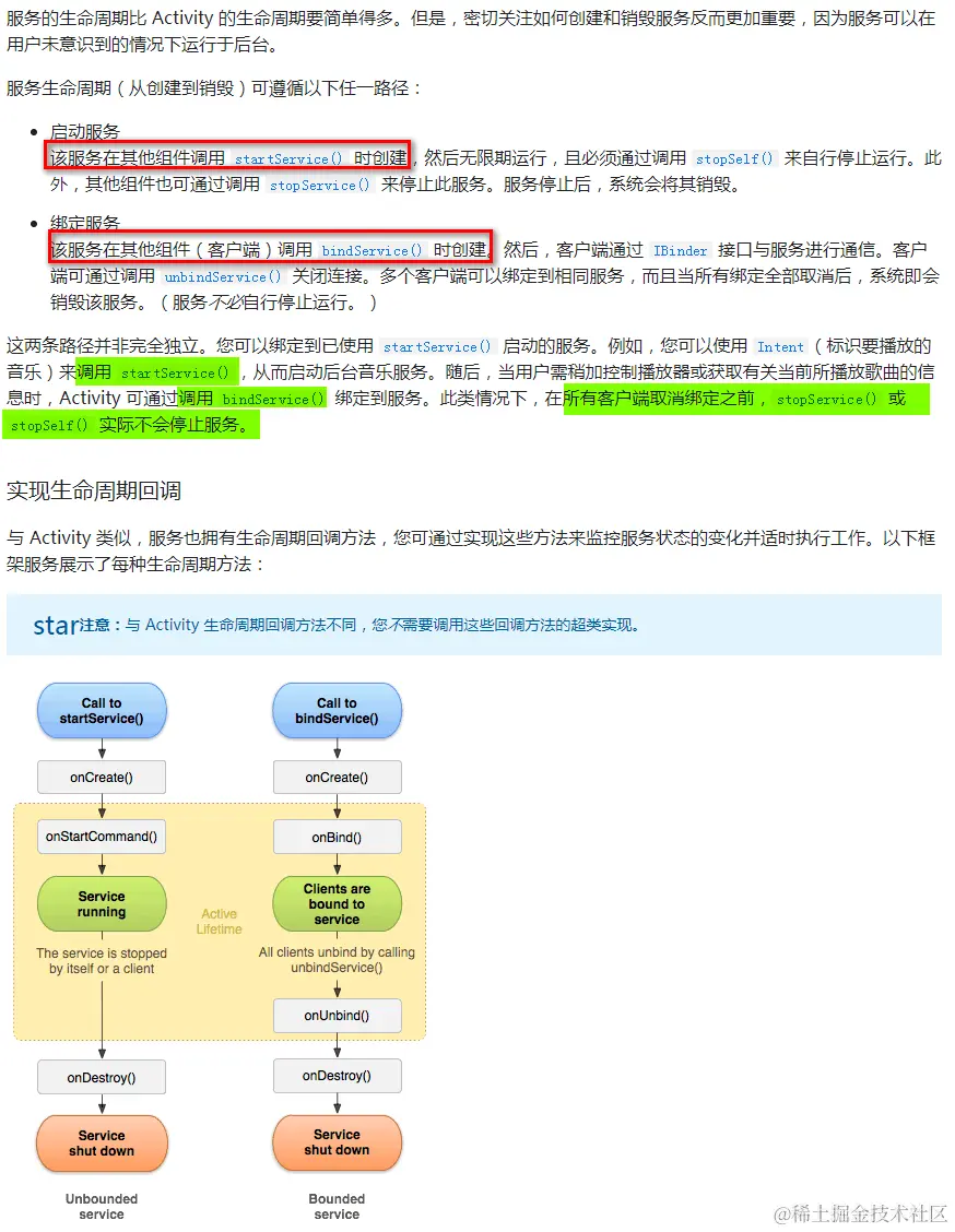 - stopService注释可印证上面图片.startService创建的Service,后续又执行bindService,直接执行stopService,不能直接销毁Service.要先unbind,再stopService.