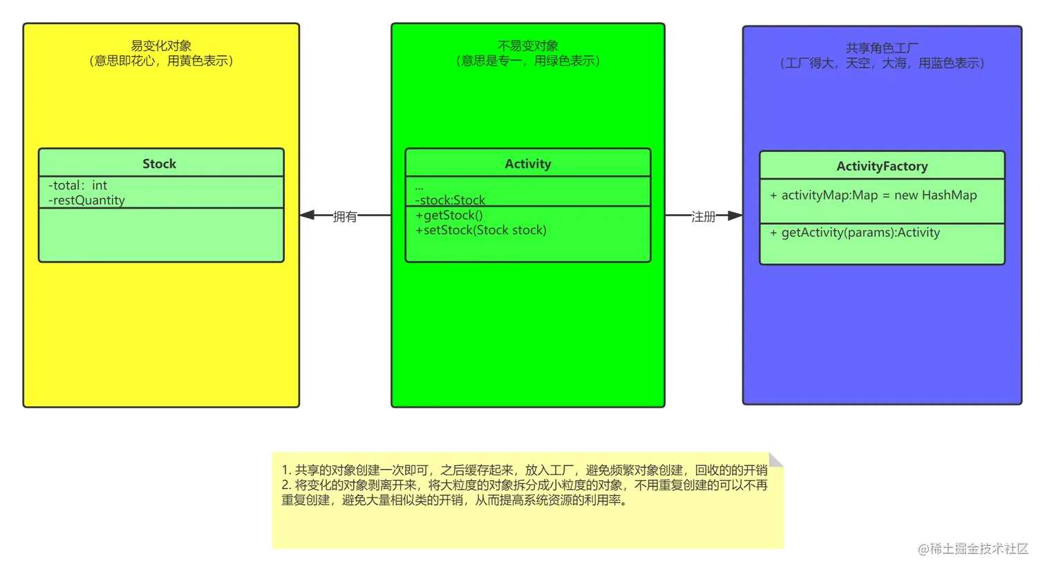 我们以商品的秒杀活动为例,当客户下完订单后,变化的是商品的库存,而商品的其他属性仍然不变。 所以可以将商品活动类(Activity)缓存到商品工厂(ActivityFactory)里,每次库存改变时,new一个新的库存类Stock塞到商品活动类中即可。