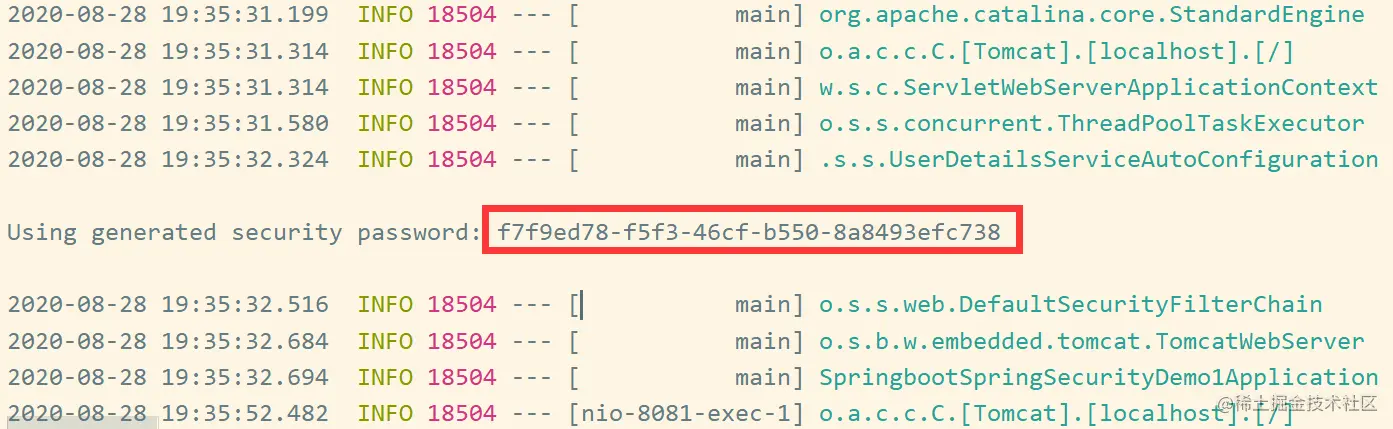 springboot已经给我们提供好了一个默认的username为“user”,其密码可以在控制台输出中得到。并且在springBoot的默认配置中,所有资源必须要通过认证后才能访问