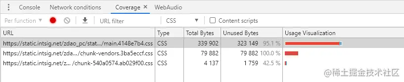 优化之前,你需要知道你的CSS样式代码哪些是关键的,哪些是不关键的,这个时候可以借助 Coverage Tool 来分析你的CSS代码。