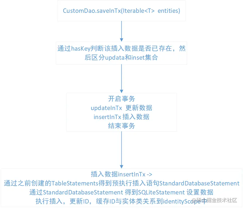 以下将对GreenDao使用原理进行分析,由于插入和更新、删除差不多,这里仅对插入fe