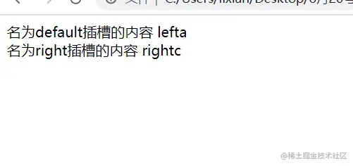 就是说,default插槽自定义了lefta属性,而right插槽自定义了rightc属性,而当你在设置default插槽的内容的时候,slot-scope对应的对象里面的属性只包含default插槽自定义的属性,而不会包含right插槽自定义的属性。所以
