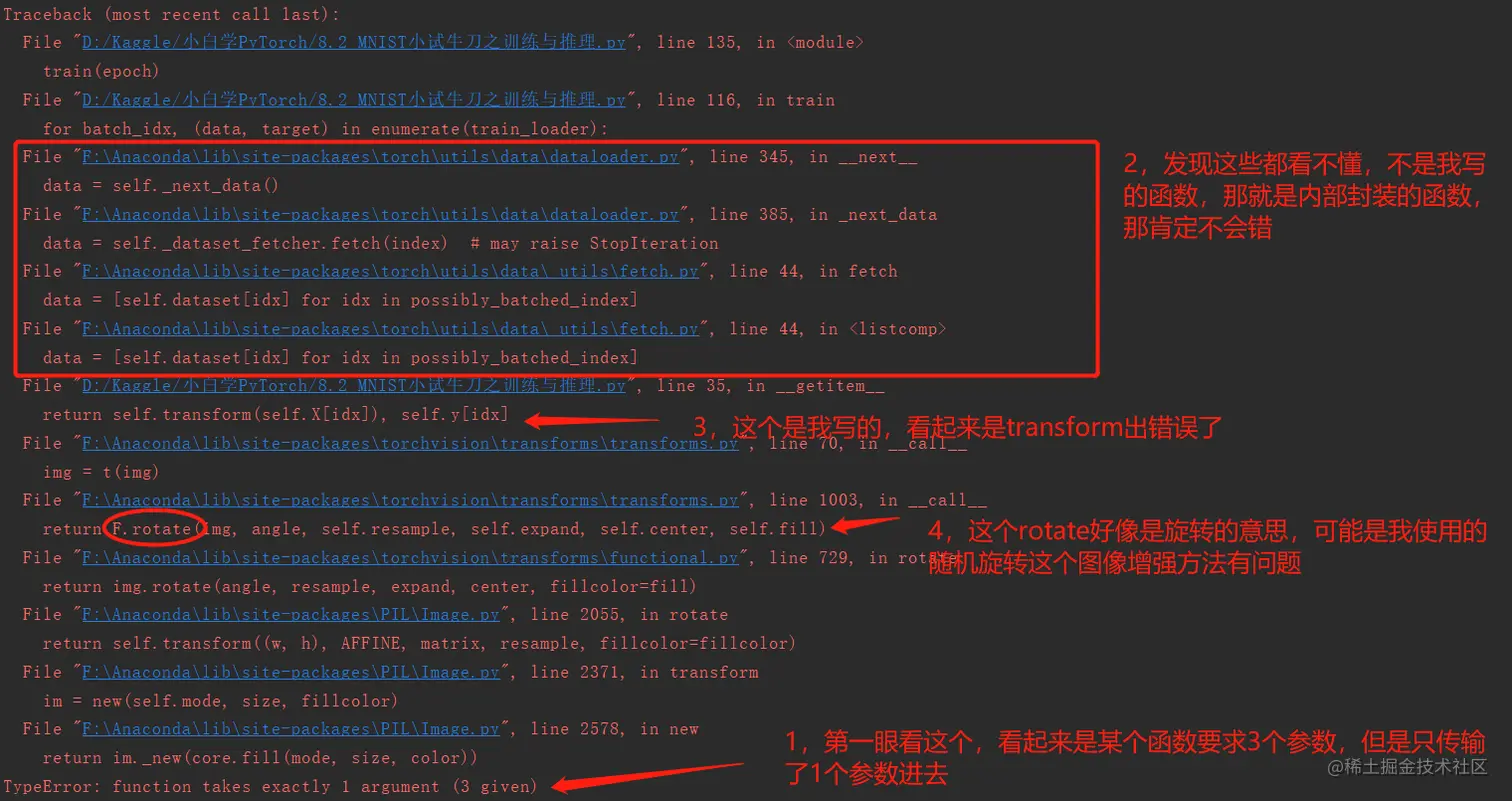 这时候我大概可以猜到,因为我们这个图片是灰度图片,是单通道的,可能这个RandomRotate函数要求输入图片是3个通道的(这个官方API上也没有细说),怎么办呢?完全可以直接在转成PIL格式之前,把numpy的那个(72000,28,28,1)复制第四维度,变成(72000,28,28,3).但是这里我想用上一节课教的一个方法torchvision.transforms.GrayScale(num_output_channels), 活学活用嘛.