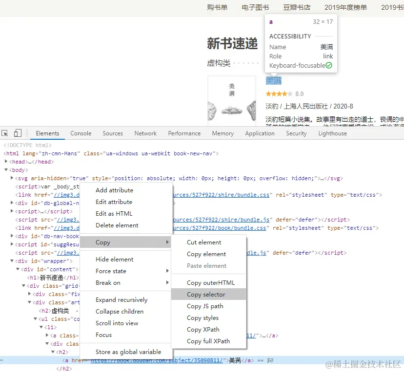 使用 chrome 的小伙伴应该都猜到了。打开 chrome 浏览器 Debug 模式,Ctrl + Shift +C 选择一个元素,然后在 html 右键选择 Copy ->Copy selector,这样就可以获取当前元素的选择器。如下图: