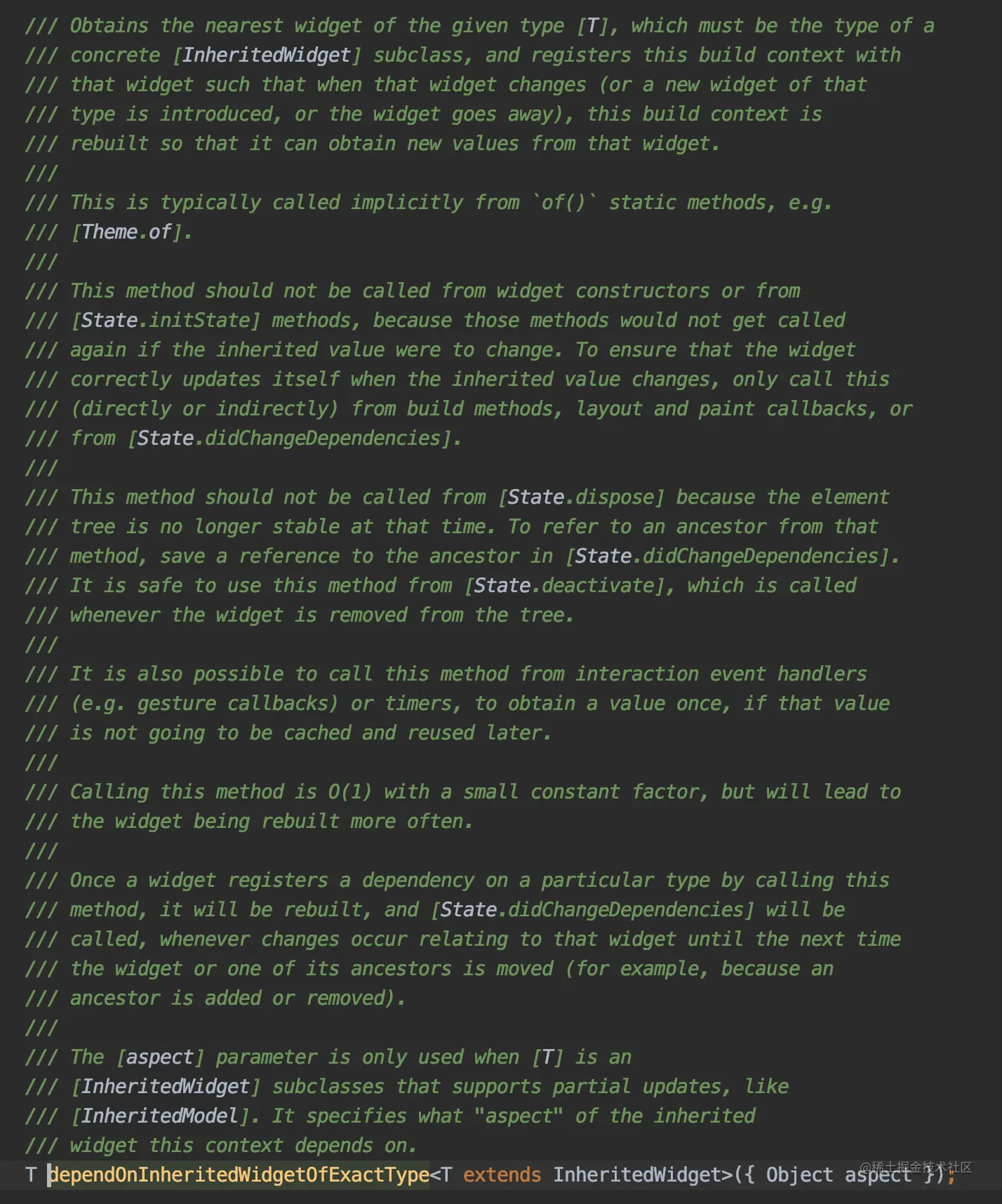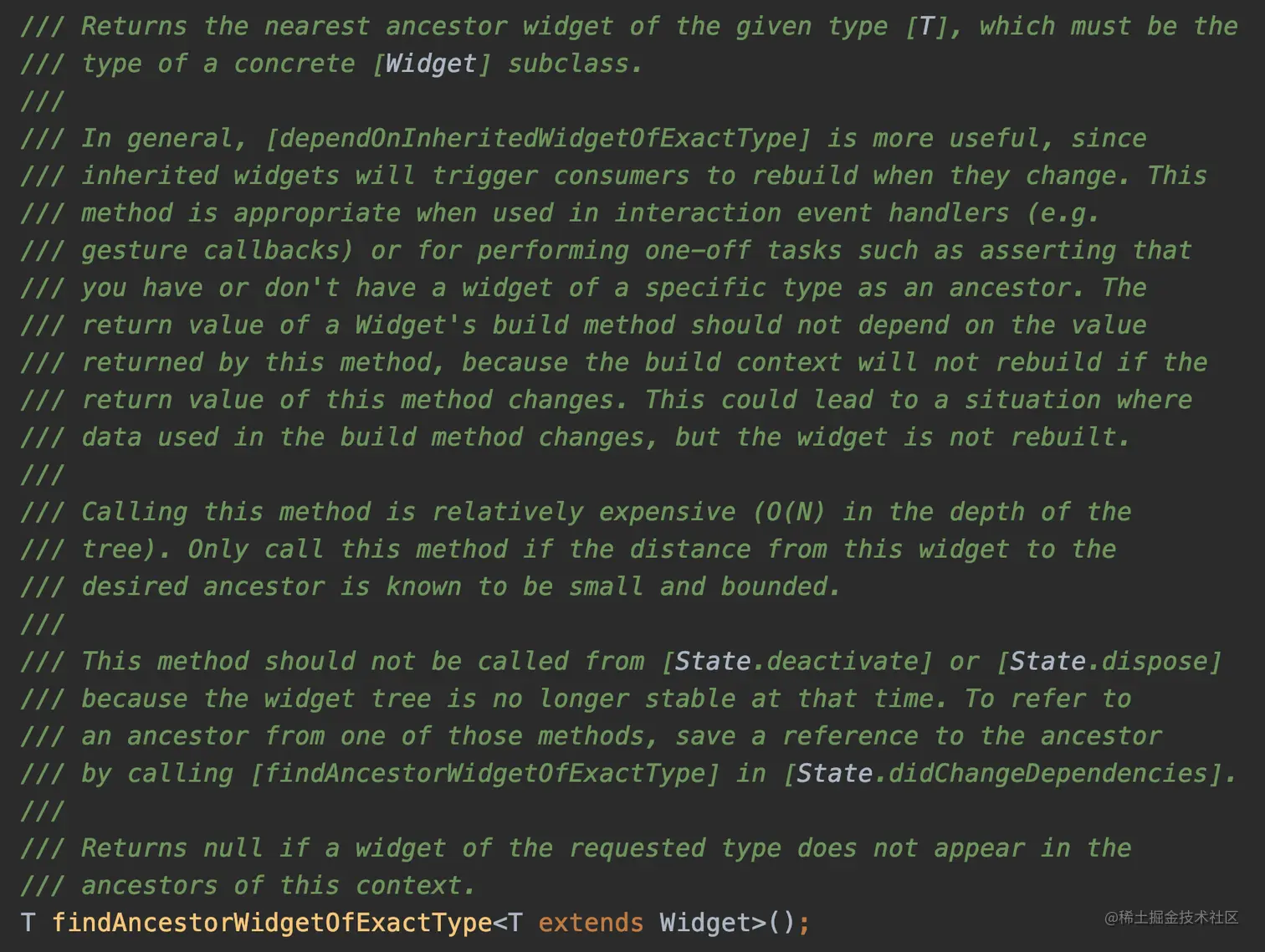 可以发现,其实他跟findAncestorWidgetOfExactType是非常类似的,主要的区别还是在于是否会rebuild,另外,dependOnInheritedWidgetOfExactType的效率很高。