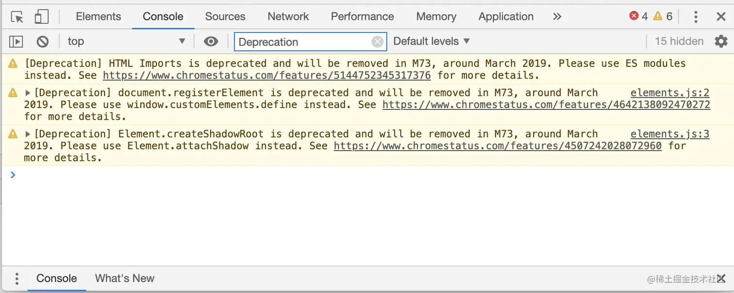 你应该看到你正在使用的每个 v0 API 的弃用消息。上面的输出显示了 HTML Imports、自定义元素 v0 和 shadow DOM v0 的消息。