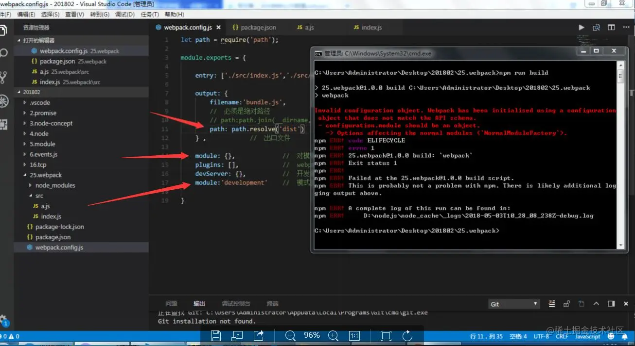 遇到的bug:单词写错报错。(无效的配置对象。 Webpack已经使用配置进行初始化 与API模式不匹配的对象。 - configuration.module应该是一个对象。 - >影响正常模块的选项(NormalModuleFactory)。)