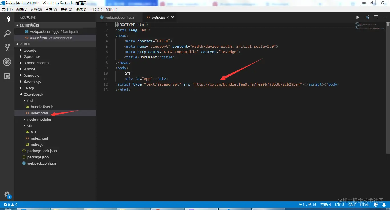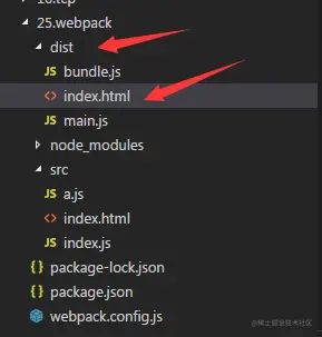 以上会自动把打包后的bundle.js引到index.html里,然后打包到dist目录下