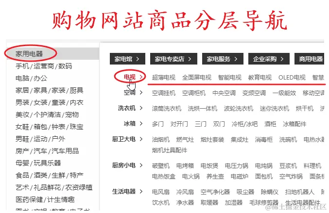 它又分为很多种:比如说电视、空调、洗衣机、冰箱……等,这是二级类目。
