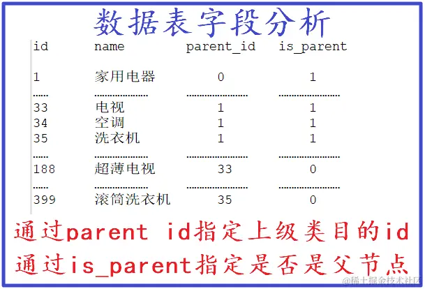 家用电器是一个父节点,它有多个子节点,子节点往下又有子节点,所以表字段设计:
