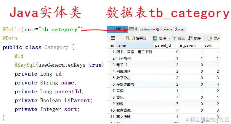 而Category实体类使用通用mapper将其和表tb_category一一对应起来。