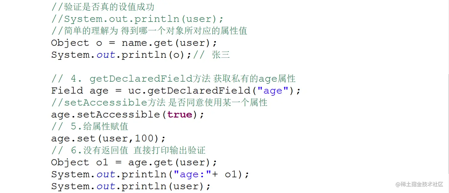 4.如果是私有的需要先调用setAccessible(true)设置访问权限,用获取的指定的字段调用get(obj)可以获取指定对象中该字段的值。