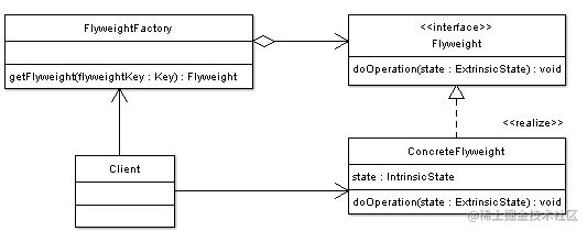 - FlyweightFactory: 创建和管理Flyweight对象的工厂,能够确保Flyweight对象的共享。它维持了一个保存不同Flyweight对象的池。如果客户端请求的Flyweight对象在池中存在,那么就返回该对象。否则,就创建客户端请求的对象,加入池中并返回给客户端。