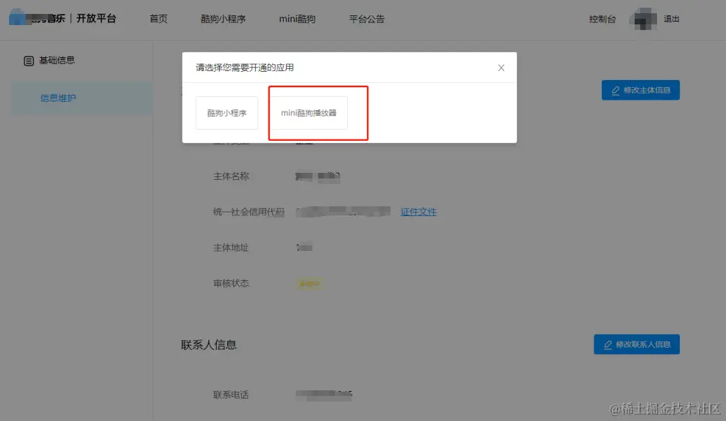 1、 打开 open.kugou.com/docs/mini-p… 并点击立即开通,使用酷狗音乐app登录账号
