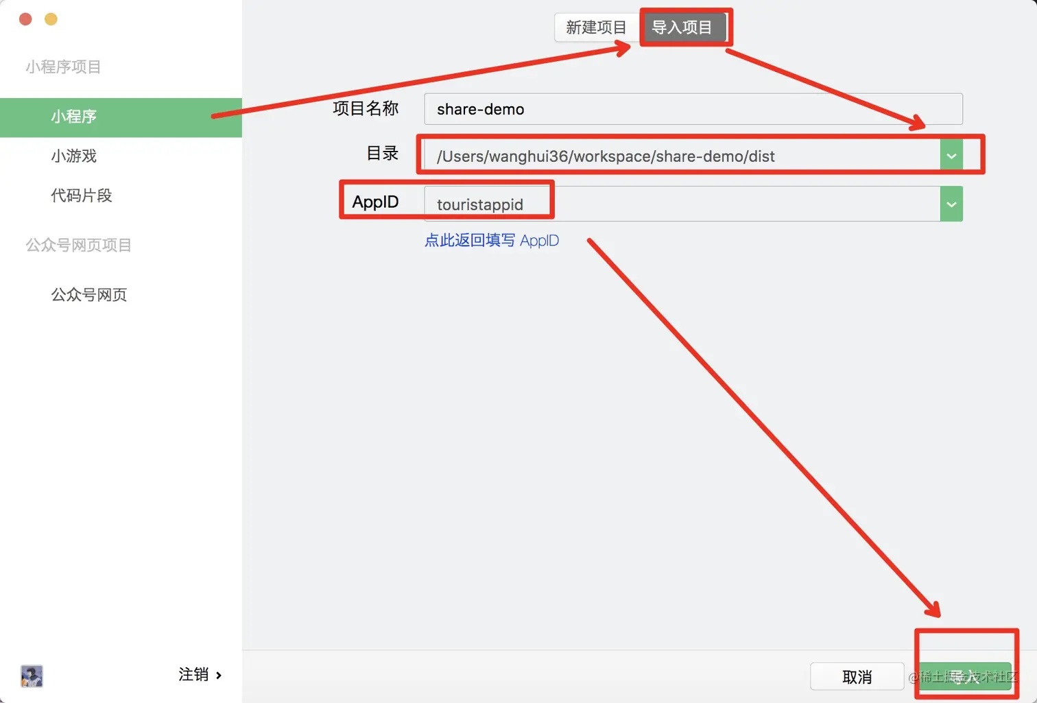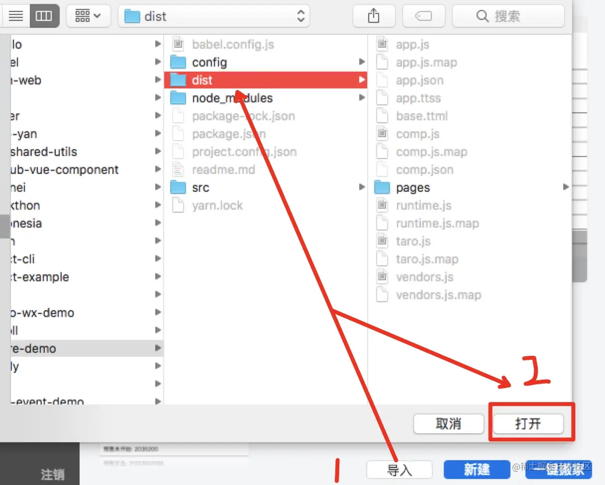 - 点击小程序--》导入---》【打开项目所在目录,到dist/即可】如