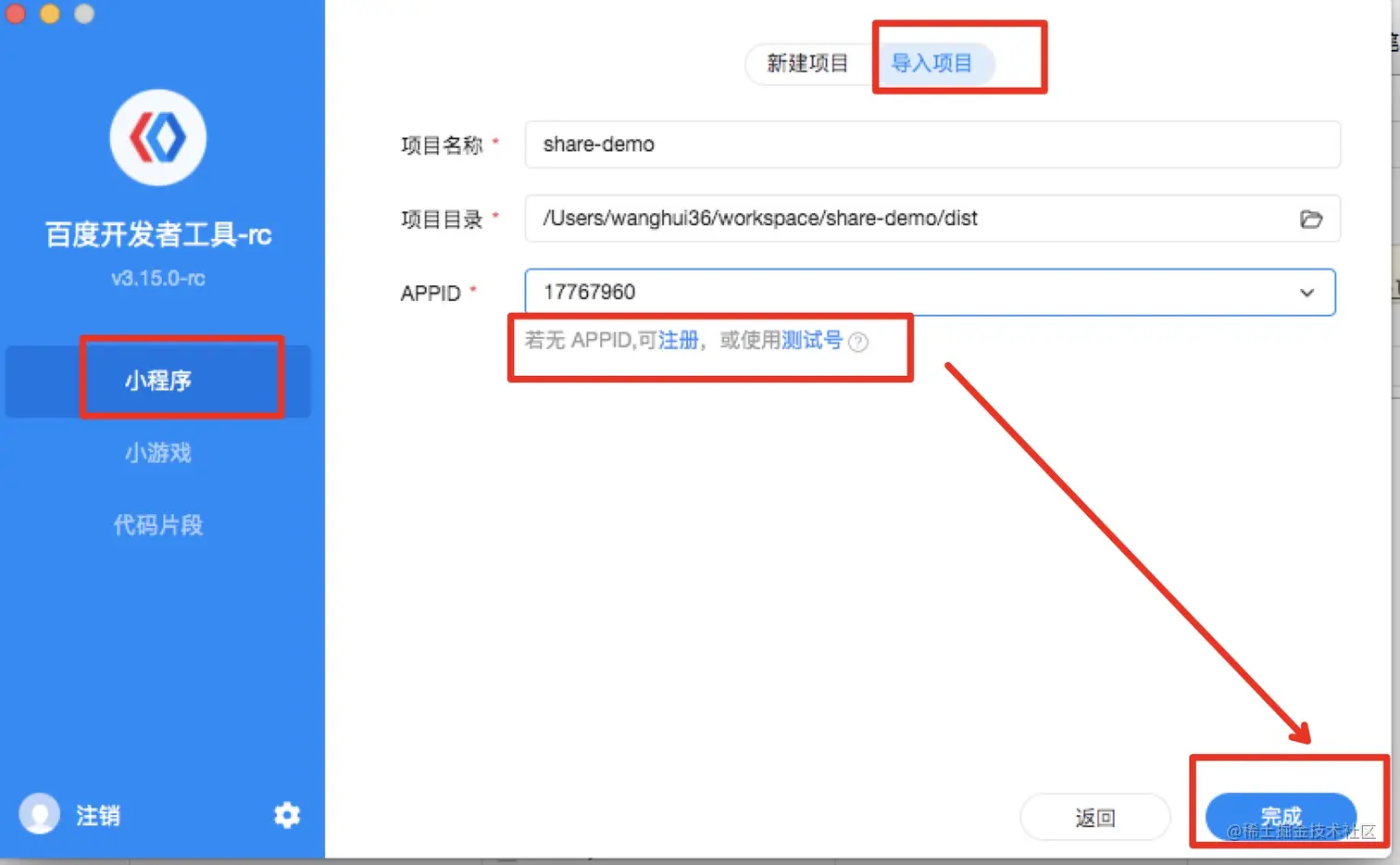- 点击小程序--》加号 ➕ ---》导入项目---》【打开项目所在目录,到dist/即可】--》无AppID,点击测试号