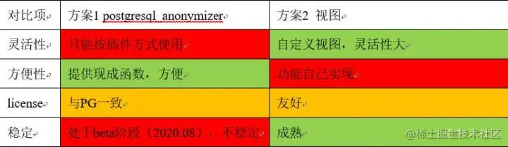 总的来看,喜欢“偷懒”、喜欢尝鲜的话,可以使用 postgresql_anonymizer 插件;但如果追求稳定,建议使用视图来实现。