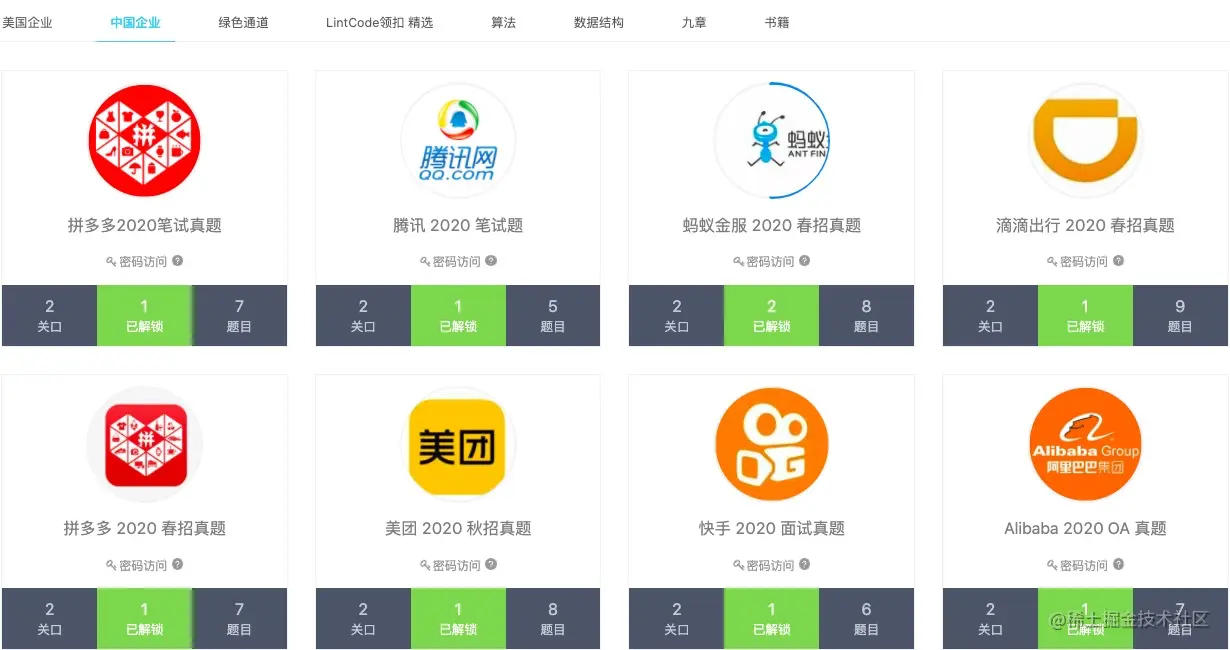 针对需要求职的程序员,找到目标公司的过往真题,有针对性地练习是最省时高效的。LintCode 上的分类阶梯训练就包含了各大知名IT企业的最新笔试题和面试真题,题目难度不等,只有解决上一关口所有的必做题才能解锁下一关口。训练的同时,还能体验“闯关打怪”的快感!