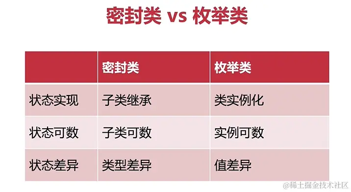 - 如果需要进行类型区分则是使用密封类,如果要进行值的区分 则用枚举