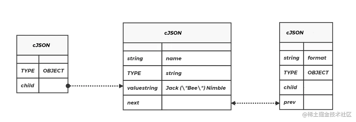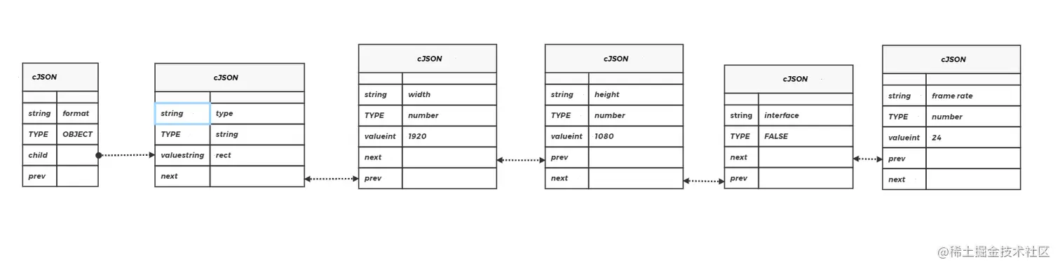 cJSON是一个仅有一个.h文件,一个.c文件组成的JSON解析器,它是由纯C(ANSI C89)实现的,跨平台性较好。cJSON是采用链表存储的。