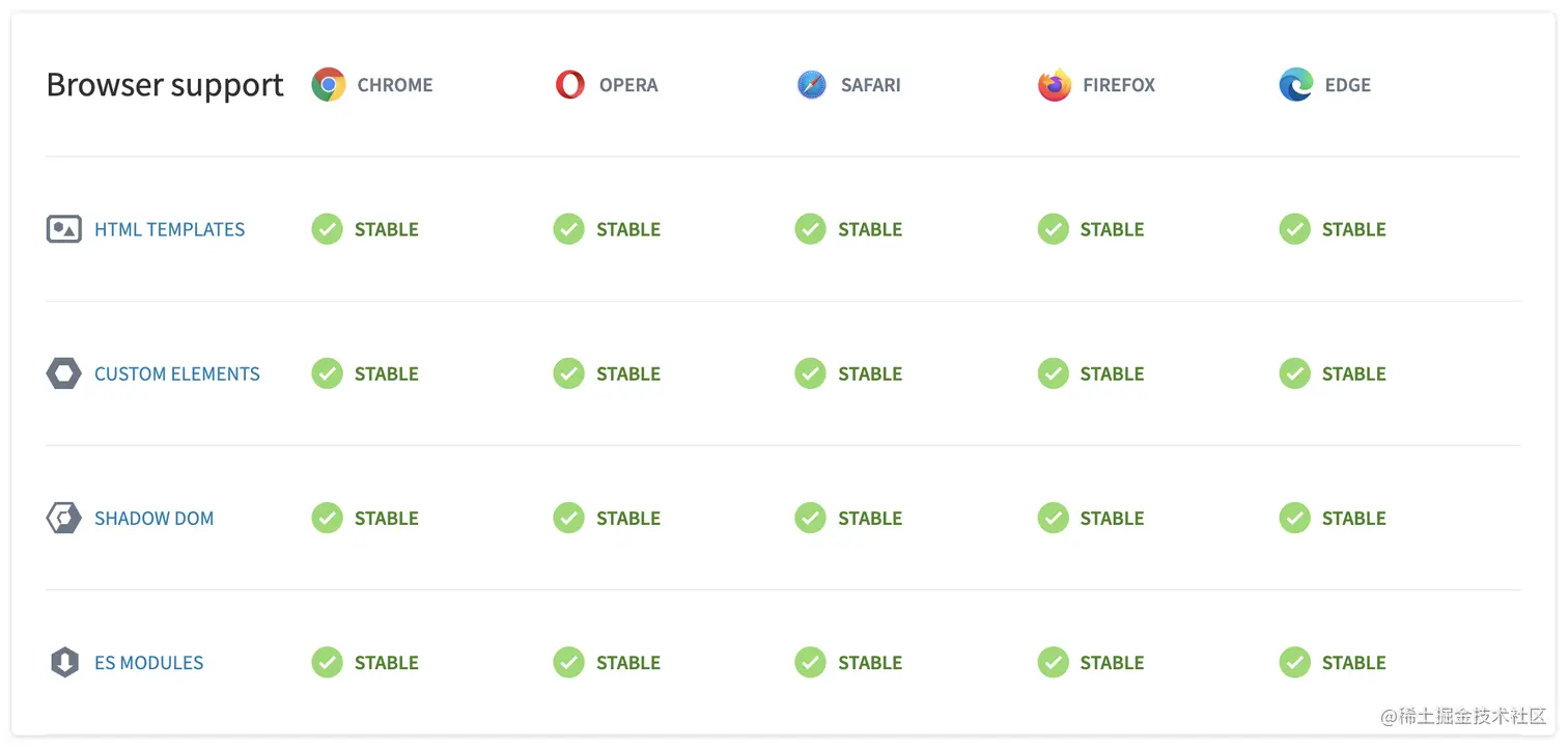 表显示了浏览器对Web Components的支持。