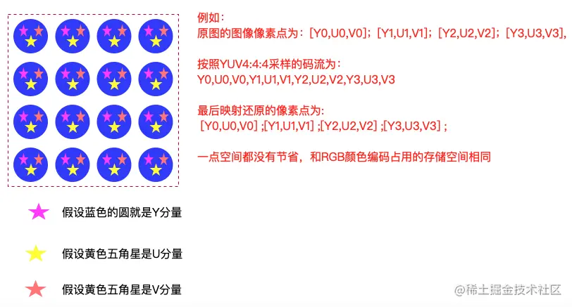YUV 4:4:4 采样,意味着 Y、U、V 三个分量的采样⽐例相同,因此在⽣成的图像⾥,每个像素的三个分量信息完整,都是 8 bit,也就 是⼀个字节。(这种采样格式并没有节省单个像素点的空间,所以不推荐使用可以直接使用RGB编码格式了) -