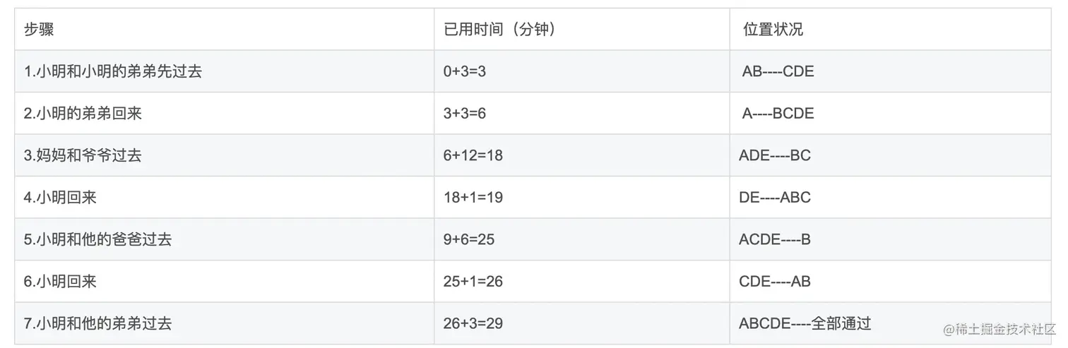 思路:5个人分别过桥,累加时间是刚好是30分钟,但是需要有人打灯,所以此方案不行。关键在于,妈妈和爷爷的速度最慢,并且速度相差最大,他们一起过桥最省时间。
