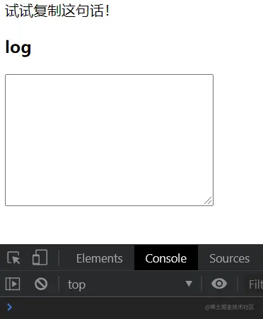当你尝试复制“试试复制这句话!”时,将会触发oncopy()函数,在oncopy()函数中,以传入的txt的值创建了一个文本节点,作为子节点,追加到textarea元素上了。因此,textarea将会显示'复制被阻止'字样!