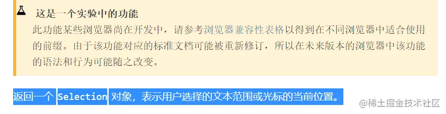 如何获取用户复制的内容呢?我们可以通过window.getSelection()方法,它返回一个**Selection对象**,表示用户选择的文本范围或光标的当前位置。当然,你也可以用document.getSelection,它们二者等价。