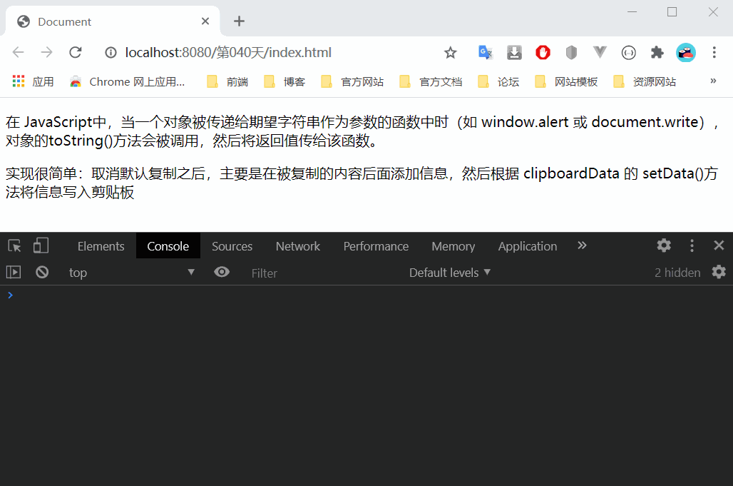 通过前面内容的学习,我们可以做第一次尝试。通过window.selection()方法获取选中的内容,然后为oncopy绑定自定义的事件,在自定义事件中,把获取到的选区内容和我们的"小尾巴"信息进行拼接。