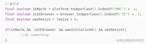 当然,这个例子只是为了说明引入解释性变量这个话题。当然,这里可以再进一步优化,把if里面的四个判断子条件独立成一个函数,用isXXX()进行命名,isXXX()只需要专注于这个判断的逻辑,外部调用者也不用关心里面是如何判断的,各司其职。