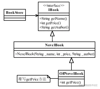 上图是已有的功能,NovelBook类具有getPrice()的方法。后来需要增加折扣的功能,按照开闭原则,尽量不修改原有的功能,也就是说不修改原接口的price,也不修改NovelBook类中的price,建议就是增加一个OffNovelBook类,继承了NovelBook类,并重写了getPrice()方法,如下图。