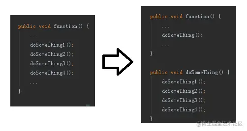 B)函数--- Long一个函数太长,可以将某一块逻辑相对独立的代码提炼出去,用方法名归纳这一块代码的逻辑,精简了原方法里的代码逻辑。这样做还有另一个好处就是,当提炼出去的这一块代码逻辑需要修改,就不用修改原方法的其他代码,缩小了影响范围。